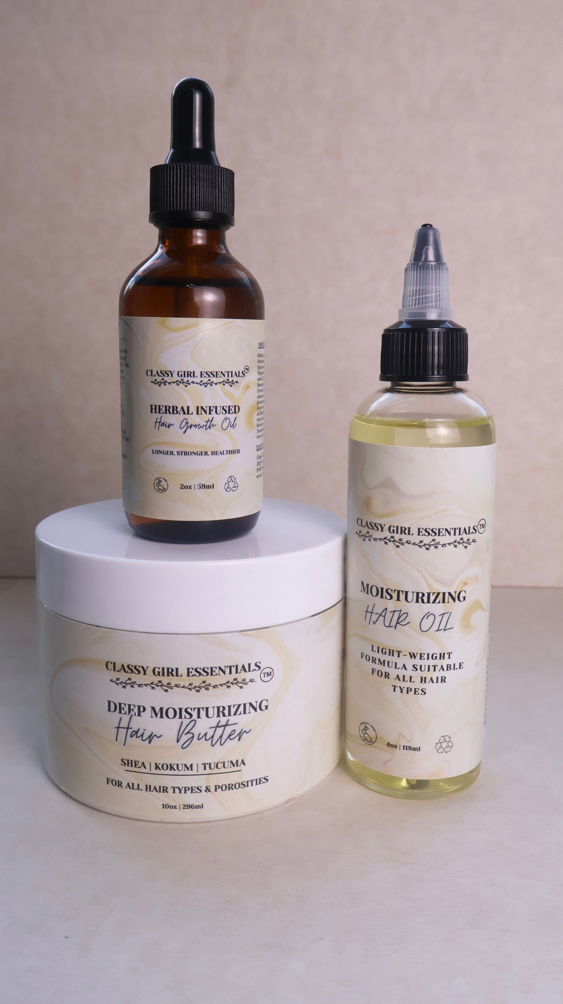 Bundle includes Deep Moisturizing Hair Butter, Light-weight Moisturizing Oil & Herbal Infused Hair Growth Oil.