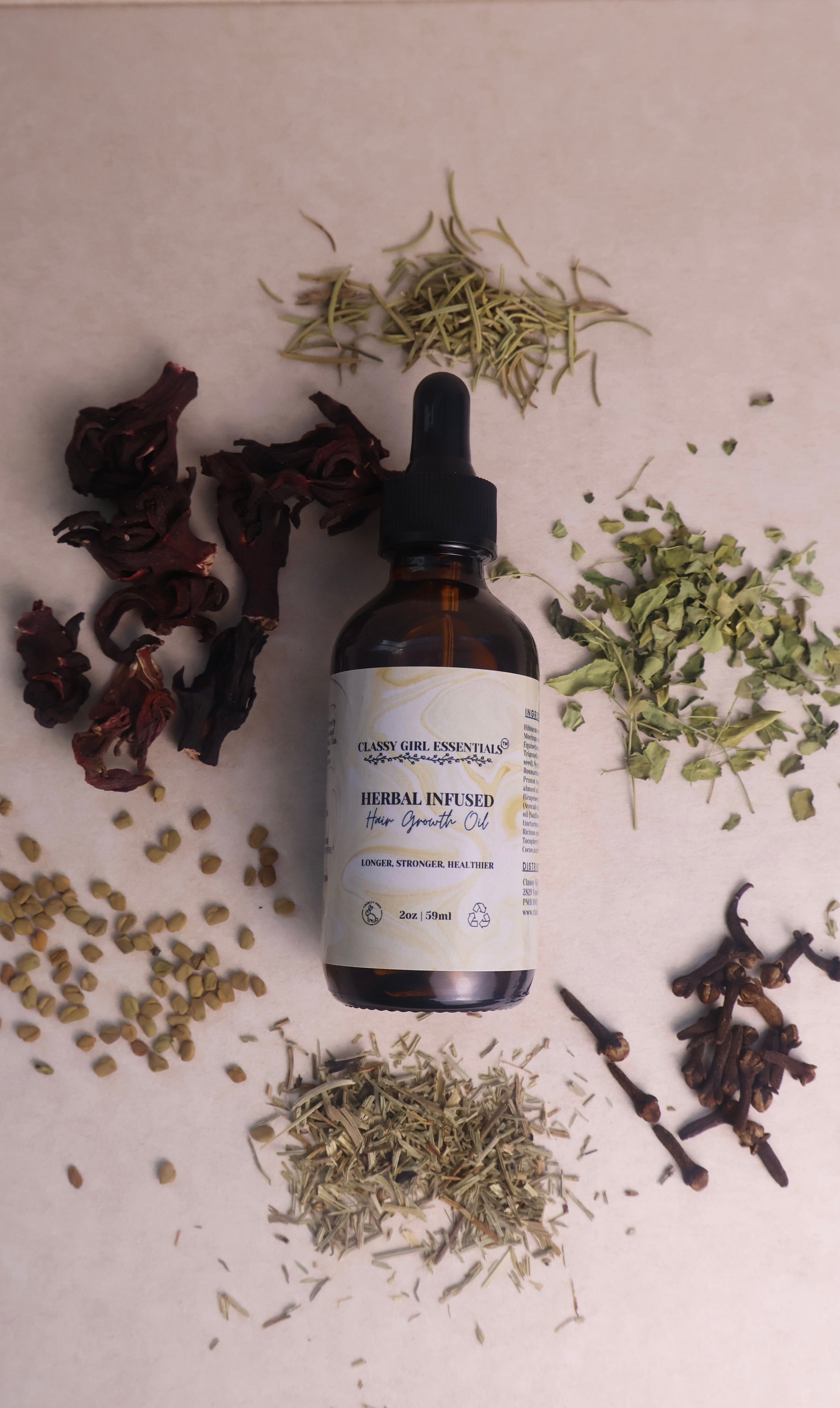 Hibiscus rosa-sinensis (Hibiscus leaf), Moringa oleifera (Moringa leaf), Equisetum arvense (Horsetail leaf), Trigonella foenum-graecum (Fenugreek seed), Syzygium aromaticum (Clove), Rosmarinus officinalis (Rosemary leaf), Prunus Amygdalus Dulcis (Sweet almond oil), Vitis vinifera seed oil (Grapeseed oil), Persea gratissima oil (Avocado oil), Helianthus annuus seed oil (Sunflower oil), Carthamus tinctorius seed oil (Safflower oil), Ricinus communis (Castor oil), Tocopheryl Acetate (Vitamin E oil), Cocos nucifera (Coconut oil)